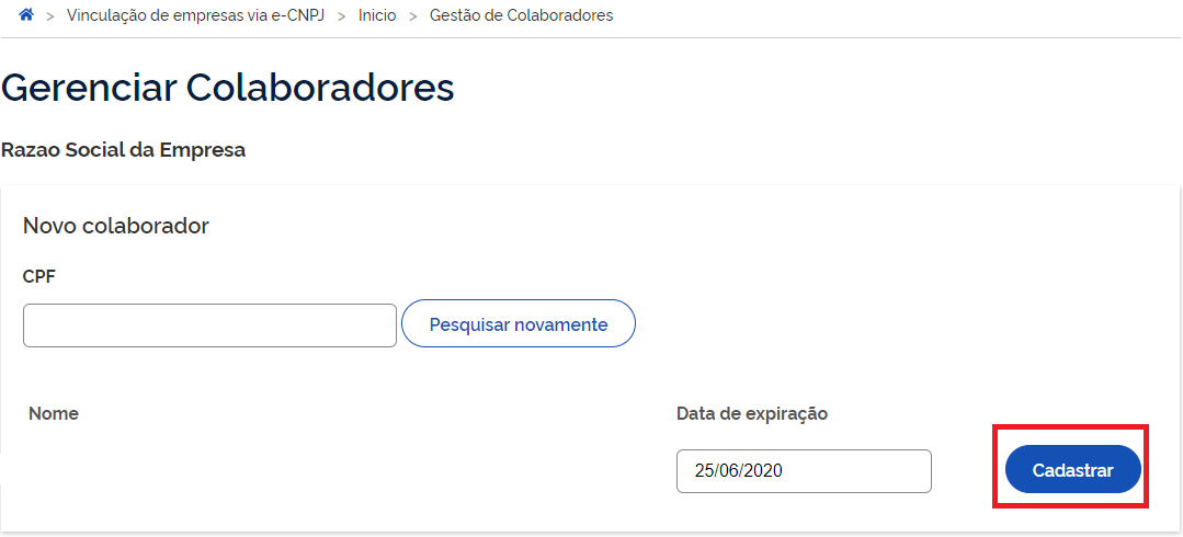 7. Cidadão digita data de expiração que CPF representará o CNPJ (A data de expiração da atuação do colaborador deverá ser até data de validade do certificado digital de pessoa jurídica responsável pelo cadastro do CNPJ. O sistema verificará informação para permitir o colaborador). Clica no botão Cadastrar.