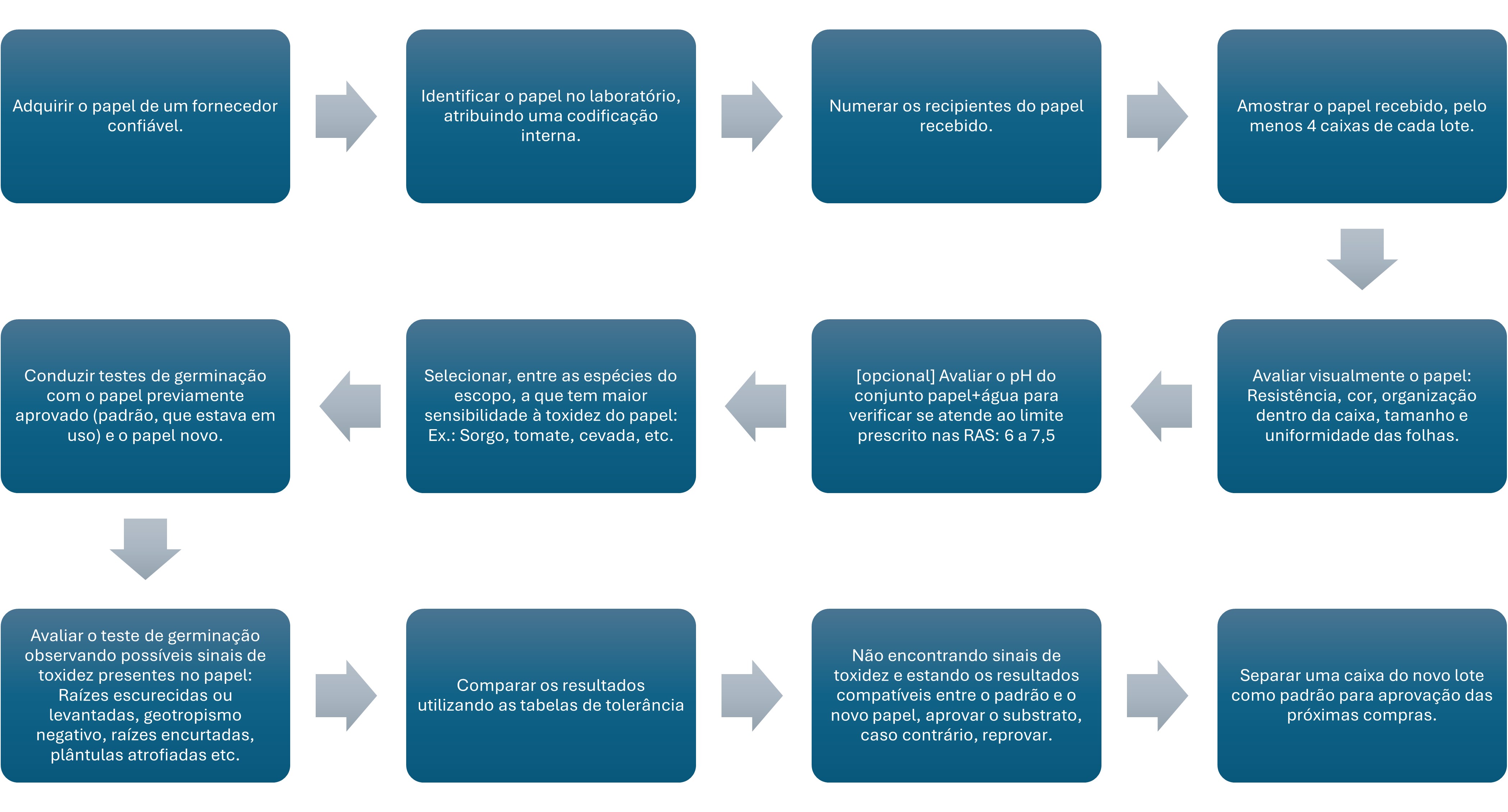 Os lotes de papel utilizados como substrato no teste de germinação devem ser tratados como equipamento e seguir as recomendações do Item 6.4 da Norma ABNT ISO/IEC 17025:2017. A cada aquisição de um novo lote de papel, deve-se realizar verificações quanto à conformidade destes, de acordo com o que determina as Regras para Análise de Sementes (RAS). Exemplos de testes de controle de qualidade do substrato usado são dados no Manual para Avaliação de Plântulas da ISTA, que pode ser adquirido no próprio site da ISTA.