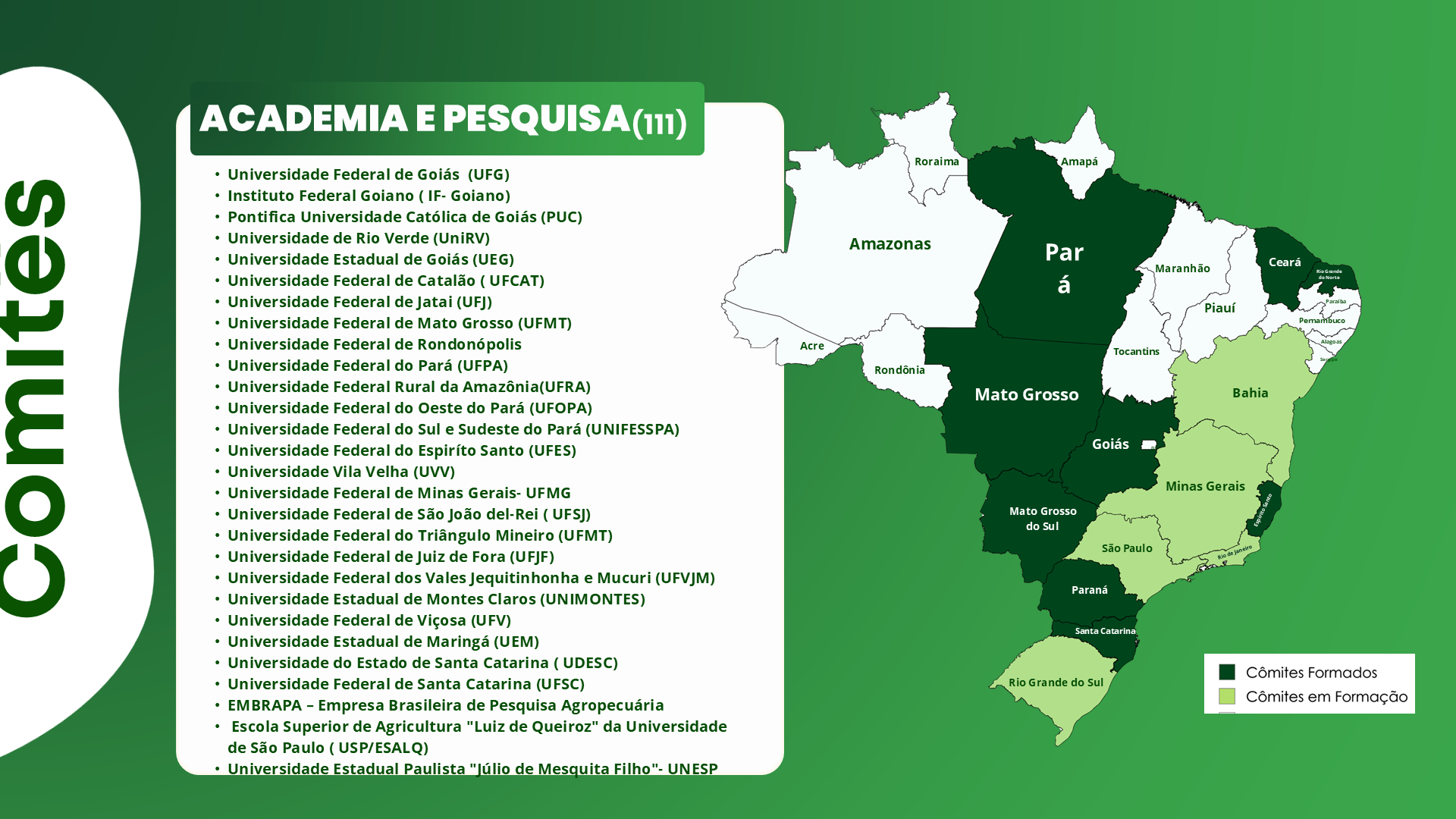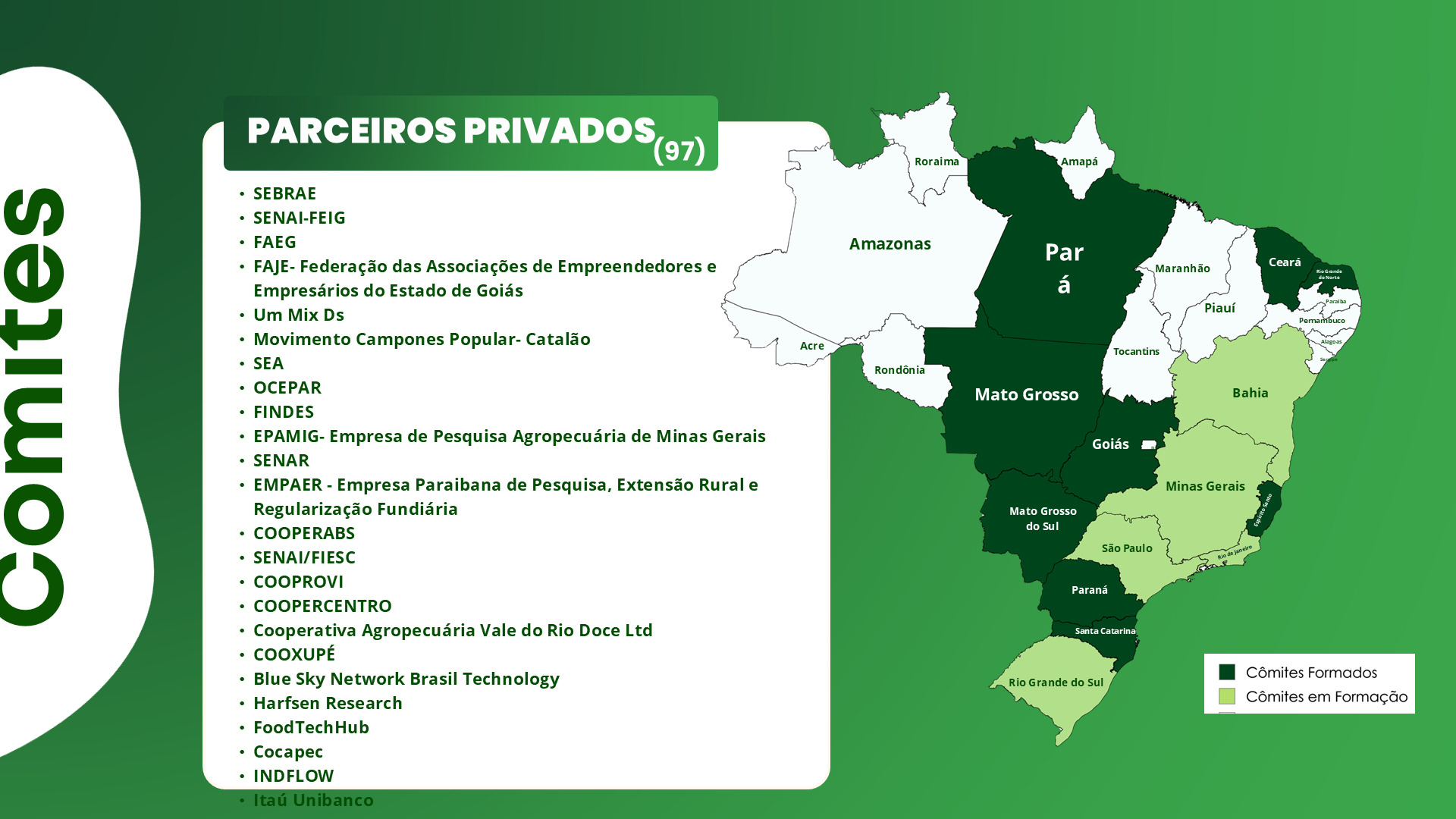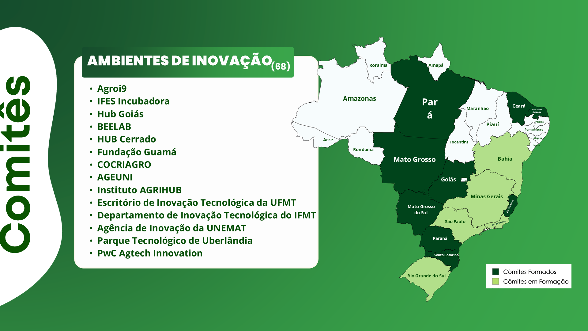 Cada comitê reúne representantes do governo, academia e pesquisa, parceiros privados e ambientes de inovação, formando uma governança local que identifica demandas, prioriza desafios e promove soluções para impulsionar a inovação no setor agropecuário.