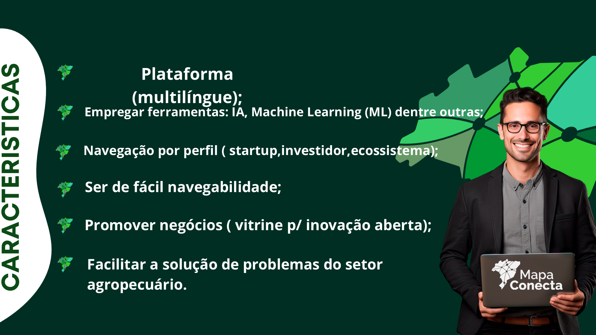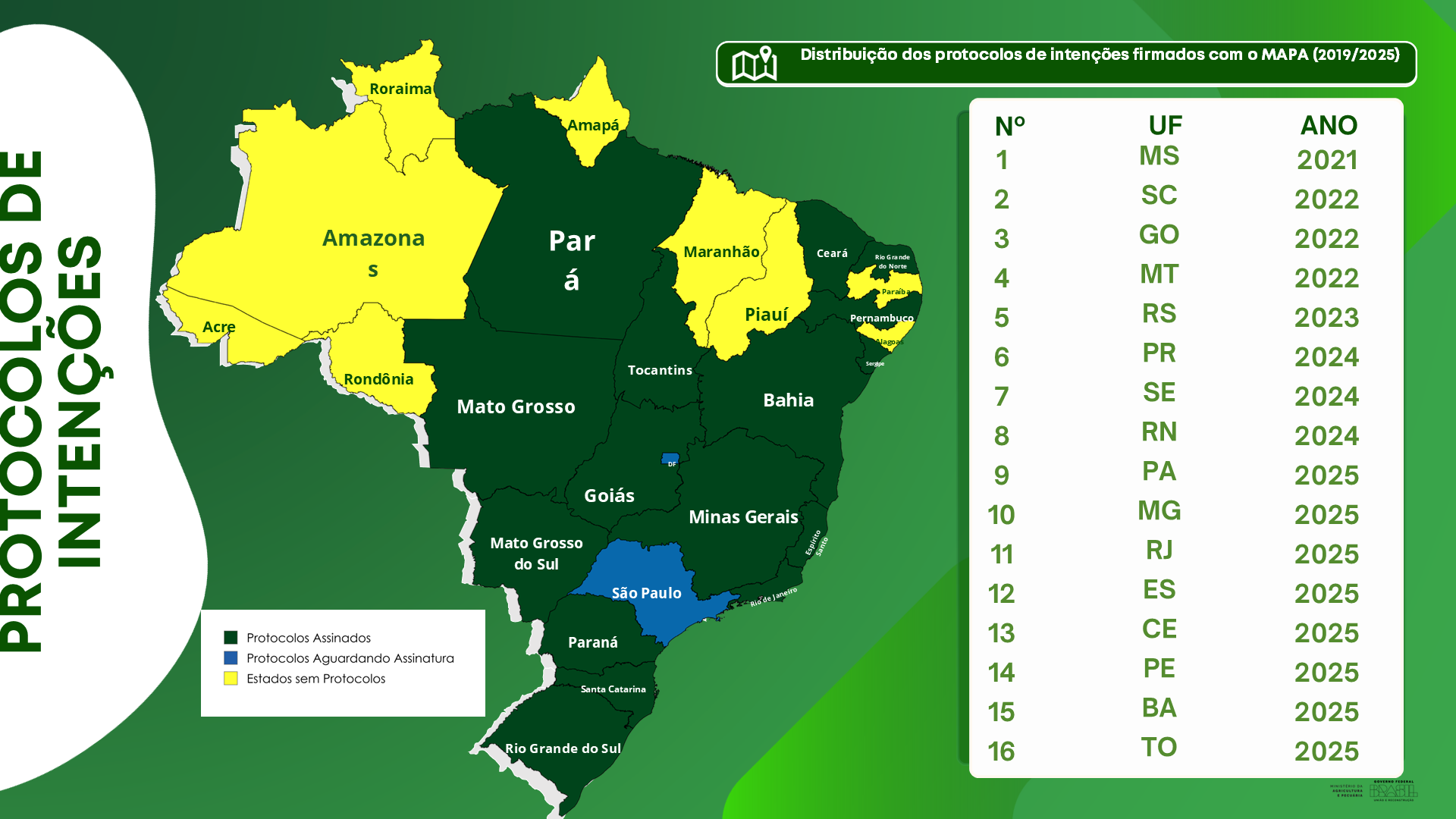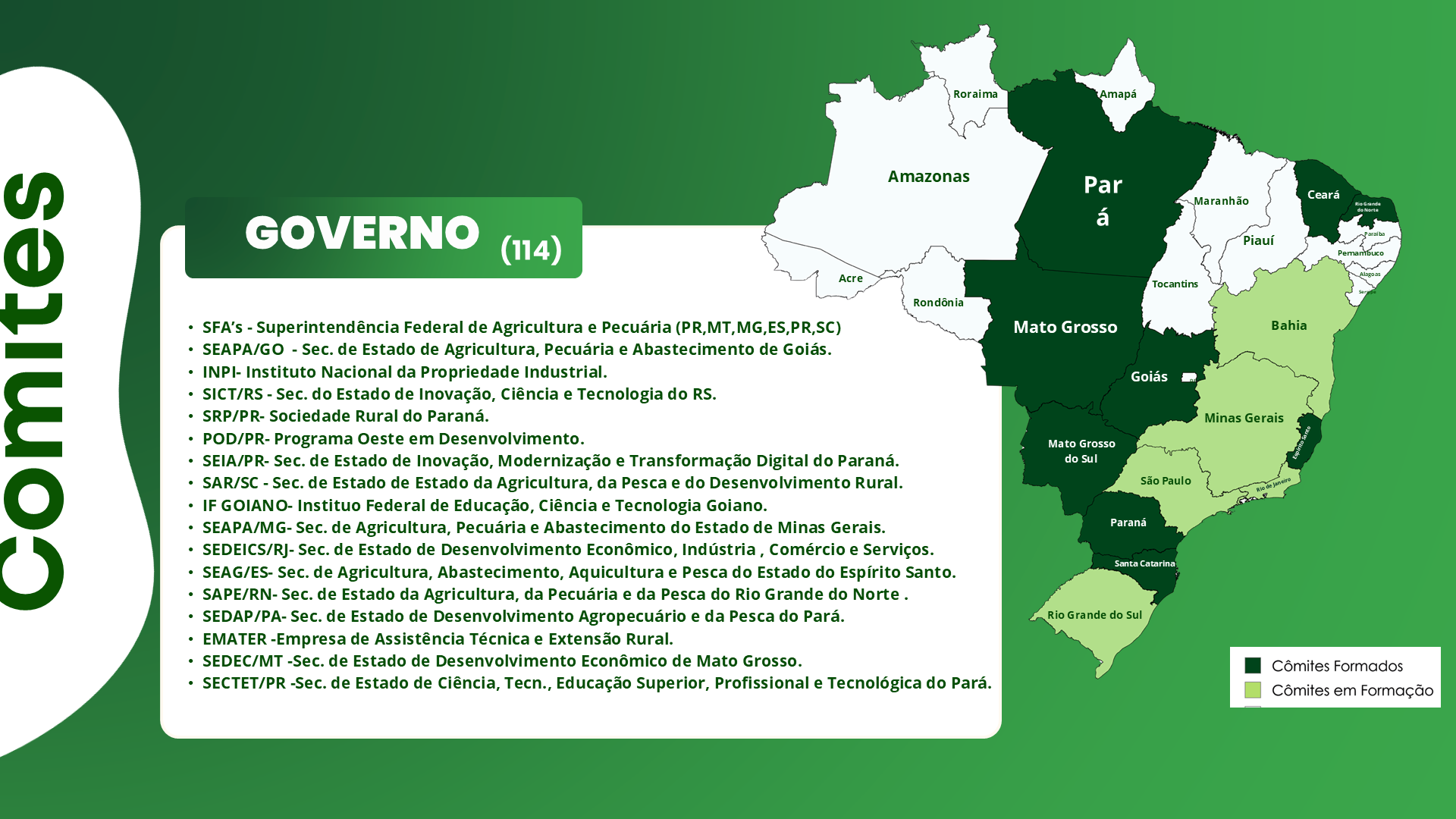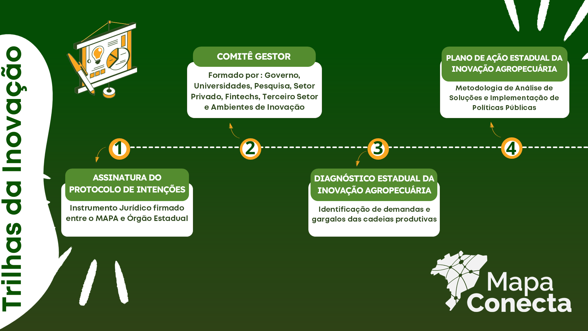 O Programa MAPA Conecta, instituído pelo Ministério da Agricultura e Pecuária, tem como um de seus pilares a consolidação de uma rede nacional de ecossistemas estaduais de inovação agropecuária. Essa rede é estruturada a partir de Comitês Estaduais de Inovação Agropecuária, formalizados por Protocolos de Intenções firmados entre o MAPA e as Secretarias Estaduais parceiras.