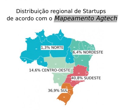 Foram mapeadas 1.574 startups no âmbito agroalimentar brasileiro, das quais 62,4% encontram-se na região Sudeste, 25,2% na região Sul; 6,1% no Centro-Oeste, 4,6% no Nordeste; e 1,7% na região Norte.