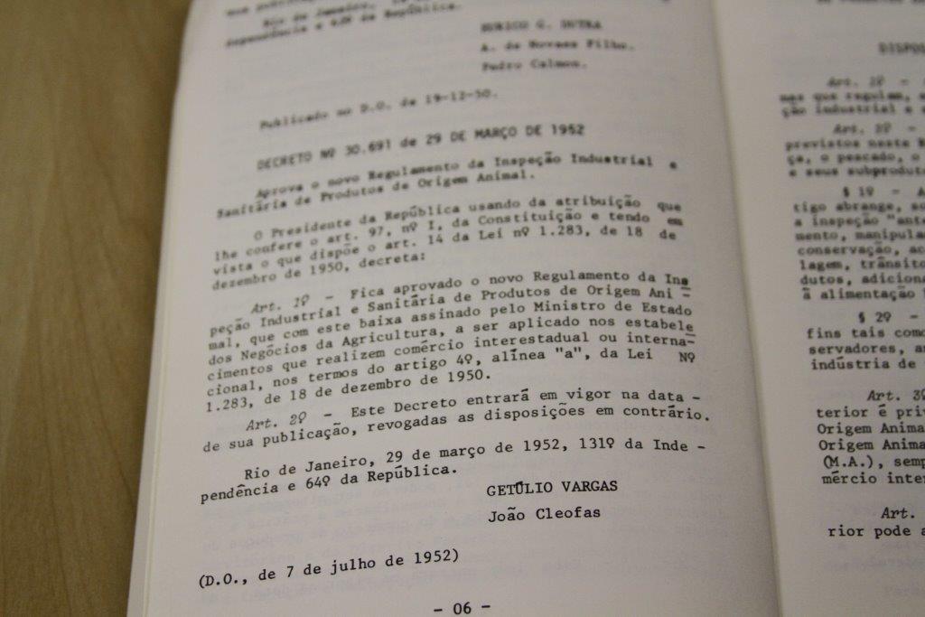 No dia 29 de março de 1952, no ano em que se comemorava 131°da Independência e 64° da República, no Rio de Janeiro, o Presidente Getúlio Vargas e o Ministro da Agricultura, João Cleofas, pernambucano de nascimento, assinam o Decreto n° 30.691, aprovando o novo Regulamento da Inspeção Industrial e Sanitária de Produtos de Origem Animal (RIISPOA). O qual foi publicado no Diário Oficial da União, na data de 07 de julho de 1952, com seus quase 1000 artigos, consolidando o primeiro código higiênico-sanitário, do Brasil.