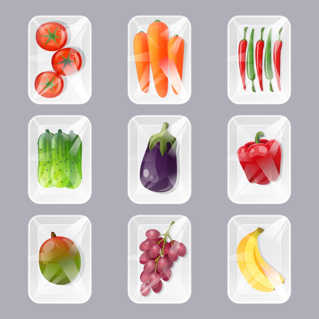 Plastic trays with fresh fruits and vegetables with wrapping by transparent film. Vector cartoon set of package fresh food in styrofoam containers in supermarket and store