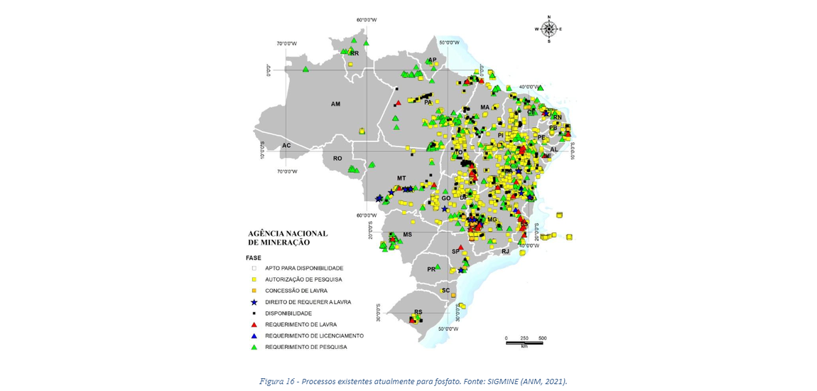Neste sentido, o governo federal criou o Decreto nº 10.657, de 24 de Março de 2021, que institui a Política de Apoio ao Licenciamento Ambiental de Projetos de Investimentos para a Produção de Minerais Estratégicos - Pró-Minerais Estratégicos que dispõe sobre sua qualificação no âmbito do Programa de Parcerias de Investimentos da Presidência da República e institui o Comitê Interministerial de Análise de Projetos de Minerais Estratégicos. Para alavancar a produção também é identificada a necessidade de linha de crédito diferenciada para projetos de expansão da produção verticalizada de fertilizantes. Observamos na consulta aos dados na ANM (Figura 16) um número considerável de requerimentos de áreas e autorizações de pesquisa para fosfato, além de alguns requerimentos de lavra. Seria necessária, como já sugerido em outros planos nacionais, uma priorização na análise destes processos além de um levantamento das concessões de lavra cujas jazidas encontram-se paralisadas, de forma a aumentar o rigor nas vistorias e reavaliação dos Planos de Pesquisa, Planos de Aproveitamento Econômico e Relatórios Anuais de Lavra de áreas com outorga de títulos minerários para fosfato.