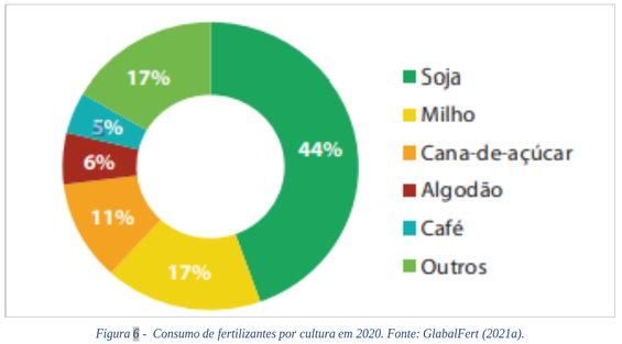 O principal nutriente aplicado no Brasil é o potássio, com 38%, seguido por fósforo, com 33%, e nitrogênio, com 29%. Em 2020, soja, milho e cana-de-açúcar responderam por 72% do consumo de fertilizantes no País (Figura 6).