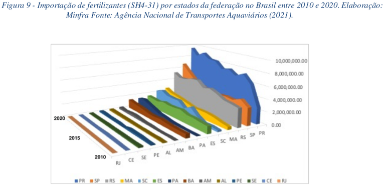 Na Figura 8, é possível verificar que, em 2010, foram produzidas 131,9 milhões de toneladas de soja e milho, sendo 68,1 milhões de toneladas do assim chamado Arco Norte com a exportação de 8,2 milhões de toneladas (14,1%), e 62,8 milhões de toneladas abaixo da linha do paralelo 16 com exportação de 50,1 milhões de toneladas (85,9%). A importação de fertilizantes teve a entrada de 11,8 milhões de toneladas em 2010, sendo 1,7 milhão de toneladas (14,7%) acima do Paralelo 16 e 10,1 milhões de toneladas (85,3%) abaixo do citado paralelo. Em 2015, foram produzidas 189,0 milhões de toneladas de soja e milho, sendo 104,7 milhões de toneladas do assim chamado Arco Norte com a exportação de 19,4 milhões de toneladas (19,6%), e 79,6 milhões de toneladas abaixo da linha do Paralelo 16 com exportação de 79,6 milhões de toneladas (80,4%). A importação de fertilizantes teve a entrada de 19,8 milhões de toneladas em 2015, sendo 2,9 milhões de toneladas (14,9%) acima do Paralelo 16 e 16,9 milhões de toneladas (85,1%) abaixo do citado paralelo. Em 2020, foram produzidas 227,4 milhões de toneladas de soja e milho, sendo 148,6 milhões de toneladas do assim chamado Arco Norte com a exportação de 42,3 milhões de toneladas (31,9%), e 78,8 abaixo da linha do Paralelo 16, com exportação de 90,4 milhões de toneladas (68,1%). A importação de fertilizantes teve a entrada de 32,3 milhões de toneladas em 2020, sendo 6,6 milhões de toneladas (20,3%) acima do Paralelo 16 e 25,7 milhões de toneladas (79,7%) abaixo do citado paralelo.