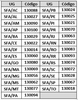 UNIDADE GESTORA (UG): Consulte a tabela abaixo.