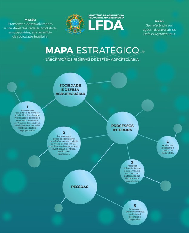 Desde 2010, a Rede LFDA vem desenvolvendo atividades voltadas à Gestão Estratégica. Atualmente, a CGAL conduz a implementação do Mapa Estratégico da Rede LFDA, alinhado à missão institucional do MAPA, e trabalha fortemente no desenvolvimento e na implementação de outros elementos estratégicos. A Rede LFDA possui 5 Objetivos Estratégicos, além de Indicadores Estratégicos de Desempenho.