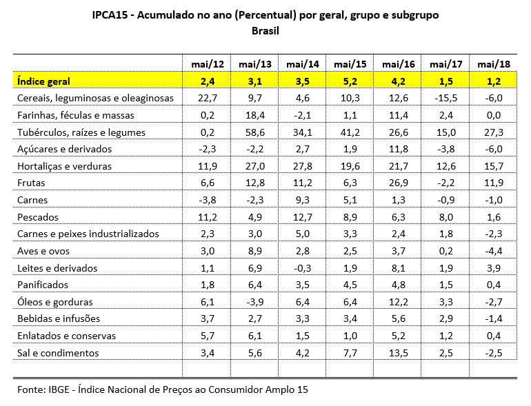 Os preços de alimentos com importante peso no índice que reflete consumo das famílias tiveram desempenho favorável para a redução dos gastos no mês de maio, de acordo com o IPCA-15 – Índice Nacional de Preços ao Consumidor Amplo divulgado pelo IBGE nesta quarta-feira (23) para maio. Neste mês, foi registrada variação do índice de 0,14%, a menor taxa para um mês de maio desde o ano 2000, quando ficou em 0,09%. O IPCA acumulado até maio ficou em 1,23%, menor nível para o período janeiro a maio desde a implantação do Plano Real.