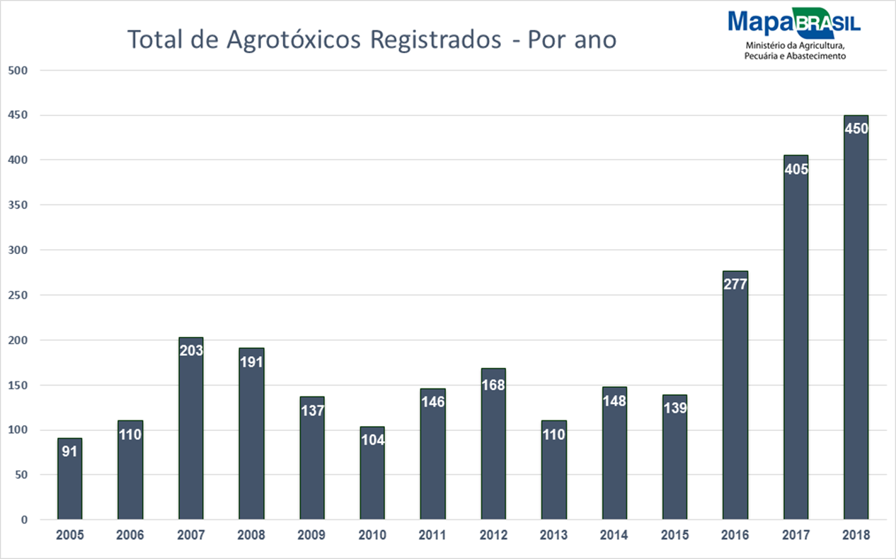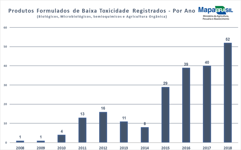 Em 2018 o Ministério da Agricultura, Pecuária e Abastecimento (Mapa) bateu o recorde no registro de defensivos de baixa toxicidade: 52 novos produtos de um total de 450 registrados. Estes agrotóxicos de baixa toxicidade - menos nocivos à saúde humana - são aqueles que contém organismos biológicos, microbiológicos, bioquímicos, semioquímicos ou extratos vegetais, e podem até mesmo ser usados na agricultura orgânica.
