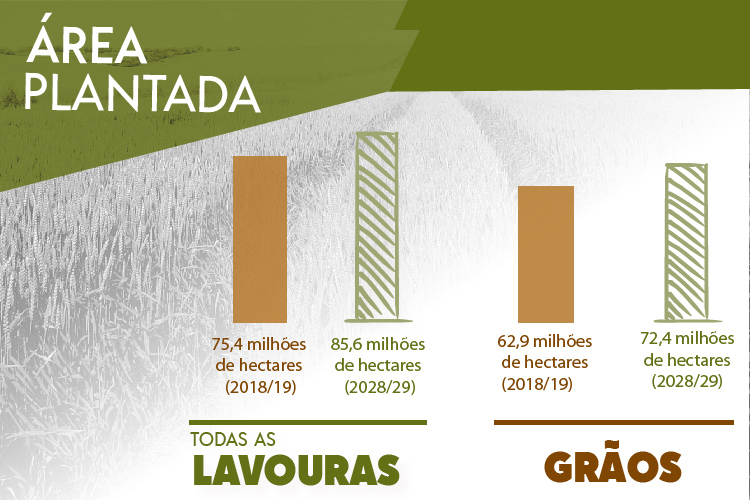 O estudo Projeções do Agronegócio, Brasil 2018/19 a 2028/29 prevê que a área total plantada com lavouras no país passará de 75,4 milhões de hectares para 85,68 milhões, um acréscimo de 10,3 milhões de hectares em dez anos. A expansão se dará, principalmente, sobre pastagens naturais e áreas degradadas. O grupo reúne os cultivos de algodão, arroz, feijão, milho, soja (grão), trigo, café, mandioca, batata inglesa, laranja, fumo, cana-de-açúcar, cacau, mandioca, uva, maçã, banana, manga, melão e mamão.