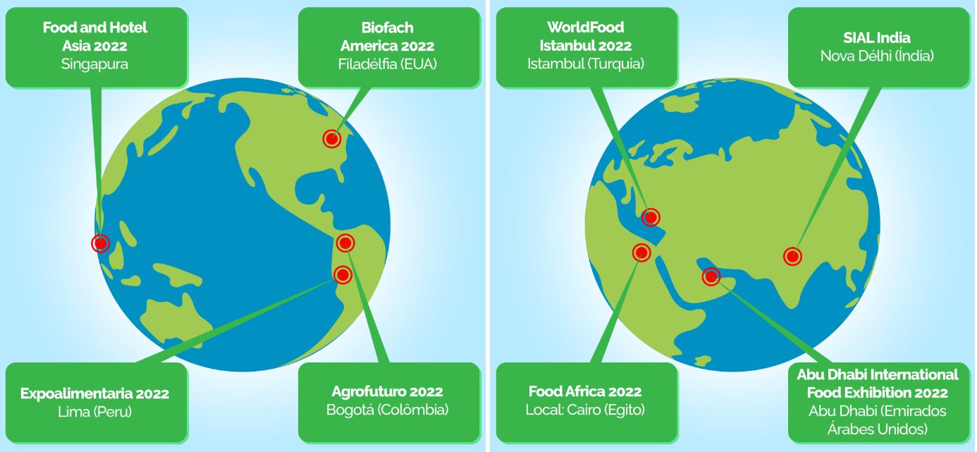 O Mapa organiza o Pavilhão Brasil em parceria com o Ministério das Relações Exteriores (MRE) e com o apoio da Agência Brasileira de Promoção de Exportações e Investimentos (Apex-Brasil). Algumas feiras, como a Saitex e Biofach, são direcionadas à participação de cooperativas e empresas de pequeno porte que planejam se inserir no mercado internacional.