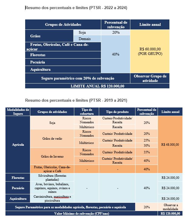 No documento, constam atualizações de percentuais de subvenção ao prêmio do seguro rural, dos limites financeiros anuais por beneficiário e as diretrizes técnicas gerais de execução do Programa de Subvenção ao Prêmio do Seguro Rural (PSR) para o próximo triênio. "O ajuste nas regras vai contribuir para facilitar o entendimento do PSR por parte dos produtores e demais agentes que operacionalizam o seguro", destaca o secretário de Política Agrícola do Ministério da Agricultura, Pecuária e Abastecimento (Mapa), César Halum.
