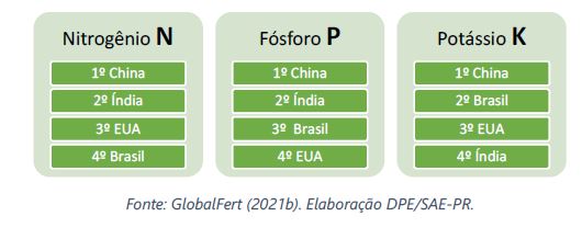 Atualmente, o Brasil ocupa a 4ª posição mundial com cerca de 8% do consumo global de fertilizantes, sendo o potássio o principal nutriente utilizado pelos produtores nacionais (38%). Na sequência, aparecem o fósforo com 33% do consumo total de fertilizantes, e o nitrogênio, com 29%. Juntos, formam a sigla NPK, tão utilizada no meio rural. Dentre as culturas que mais demandam o uso de fertilizantes estão a soja, o milho e a cana-de-açúcar, somando mais de 73% do consumo nacional.