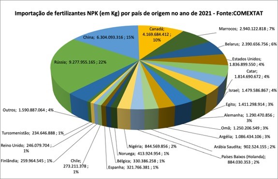 Importação de fertilizantes NPK por país de origem no ano de 2021 (COMEXTAT, 2021)