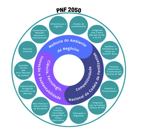 O Plano Nacional de Fertilizantes (PNF) é uma referência para o planejamento do setor de fertilizantes para os próximos 28 anos (até 2050), promovendo o desenvolvimento do agronegócio nacional e considerando a complexidade do setor, com foco nos principais elos da cadeia: indústria tradicional, produtores rurais, cadeias emergentes, novas tecnologias, uso de insumos minerais, inovação e sustentabilidade ambiental.