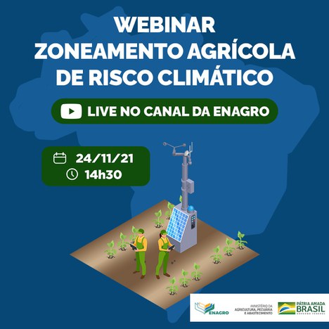 O Ministério da Agricultura, Pecuária e Abastecimento, através do canal do youtube da ENAGRO , promove no dia 24 de novembro às 14h30, o primeiro webinar do Programa Nacional de Zoneamento Agrícola de Risco Climático (Zarc).