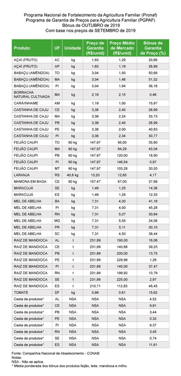A relação dos produtos do Programa de Garantia de Preços para a Agricultura Familiar (PGPAF) com direito ao desconto em outubro nas operações de crédito junto a instituições financeiras foi publicada nesta terça-feira (8) no Diário Oficial da União .