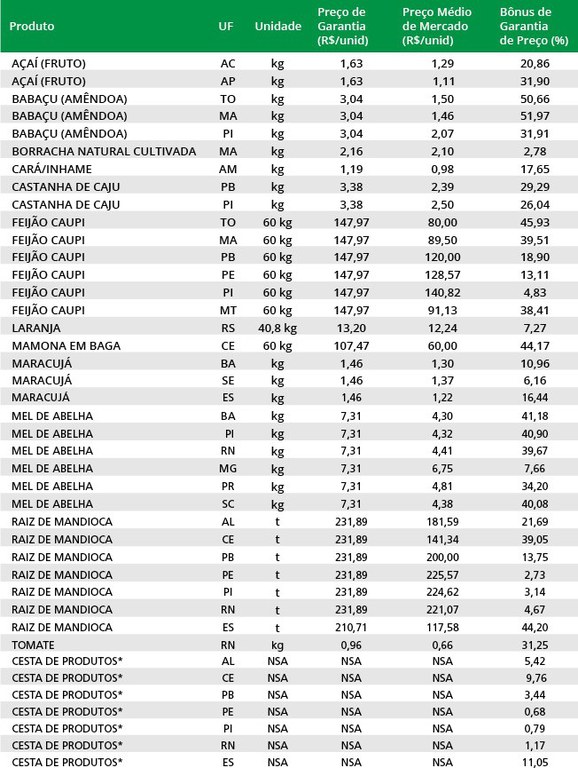 Os produtos considerados com bônus são: açaí, babaçu (amêndoa), borracha natural cultivada, castanha de caju, cará/inhame, feijão caupi, laranja, mamona em baga, maracujá, mel, raiz de mandioca e tomate.