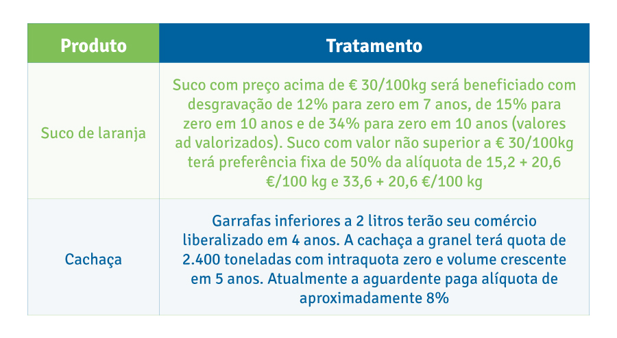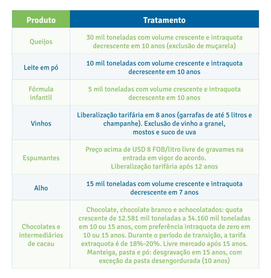 No acordo, quase 96% das importações do Mercosul alcançarão livre comércio em 15 anos. Foram estabelecidas cotas e períodos de transição mais longos para produtos considerados mais sensíveis pelos países sul-americanos.