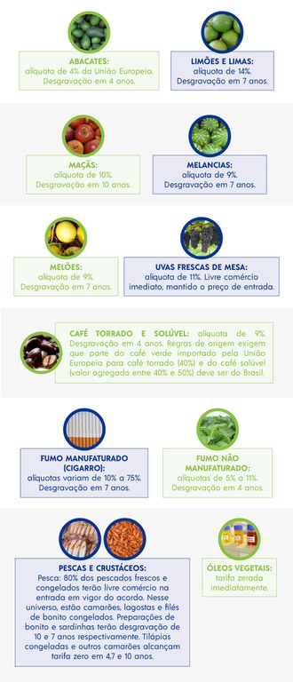 Com o acordo Mercosul-União Europeia, cerca de 99% das exportações agrícolas brasileiras terão as tarifas eliminadas (zeradas) ou parcialmente reduzidas. Aproximadamente 82% dos produtos agrícolas terão acesso livre ao mercado europeu e o restante ampliará a participação por meio de cotas preferenciais fixas.