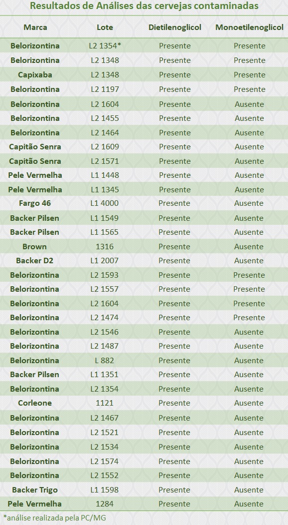 O Ministério da Agricultura, Pecuária e Abastecimento (Mapa) identificou a presença do contaminante dietilenoglicol em mais 11 lotes de cervejas Backer. Agora são dez produtos da Cervejaria Backer contendo as substâncias tóxicas. São eles: Belorizontina, Capixaba, Capitão Senra, Pele Vermelha, Fargo 46, Backer Pilsen, Brown, Backer D2, Corleone e Backer Trigo. Até o momento, as análises realizadas pelos Laboratórios Federais de Defesa Agropecuária constataram 32 lotes contaminados.