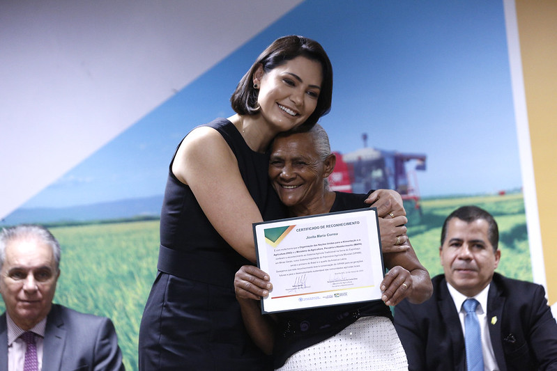 A ministra Tereza Cristina (Agricultura, Pecuária e Abastecimento) e a primeira-dama Michelle Bolsonaro participaram da cerimônia de reconhecimento do primeiro Patrimônio Agrícola Mundial concedido ao Brasil pela Organização das Nações Unidas para a Alimentação e Agricultura (FAO). No evento, realizado na sede do Ministério, foram entregues certificados às apanhadoras de sempre-vivas que integram o sistema tradicional agrícola dos apanhadores dessas flores na Serra do Espinhaço, em Minas Gerais.