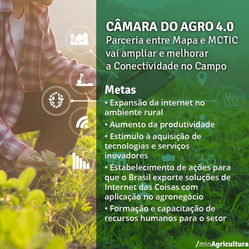 O Ministério da Agricultura e o Ministério da Ciência, Tecnologia, Inovações e Comunicações (MCTIC) lançaram, nesta quinta-feira (15), a Câmara do Agro 4.0. Resultado de um acordo de cooperação técnica entre as duas pastas, a iniciativa visa ampliar a conectividade no campo e estabelecer ações para que o Brasil seja um exportador de soluções de internet das coisas com aplicação no agronegócio.