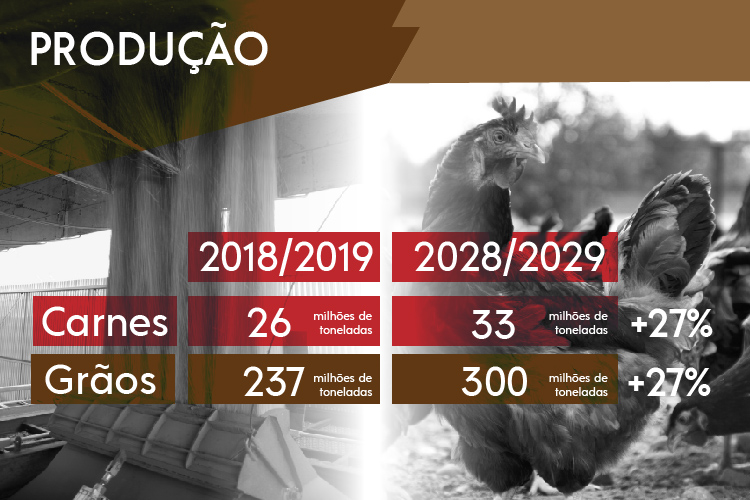 As carnes (bovina, suína e de frango) devem passar do volume atual de 26 milhões de toneladas para 33 milhões de toneladas, alta de 27%. As carnes suínas e de frango são as que apresentam maior destaque nos próximos anos, com incremento de aproximadamente 28% cada uma.
