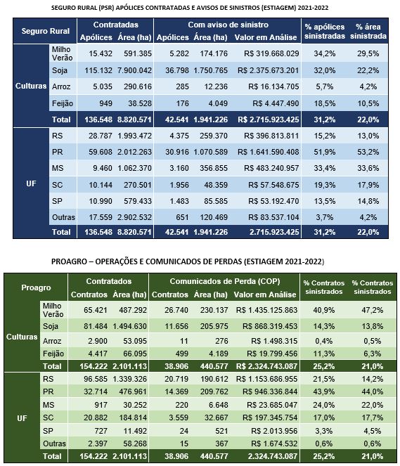 Um levantamento da Secretaria de Política Agrícola do Ministério da Agricultura, Pecuária e Abastecimento (Mapa) mostra a dimensão dos comunicados de perdas e avisos de sinistros pelos produtores afetados pela seca. No total, 42.541 apólices de seguro rural foram acionadas e 38.906 comunicados de perdas (COPs) realizados no Programa de Garantia da Atividade Agropecuária (Proagro) na atual safra de verão até o dia 20 de janeiro, totalizando mais de 81 mil acionamentos pelos produtores. Os dados são das Companhias Seguradoras habilitadas no Programa de Subvenção ao Prêmio do Seguro Rural (PSR) do Mapa e do Banco Central do Brasil, autarquia responsável pelo Proagro.