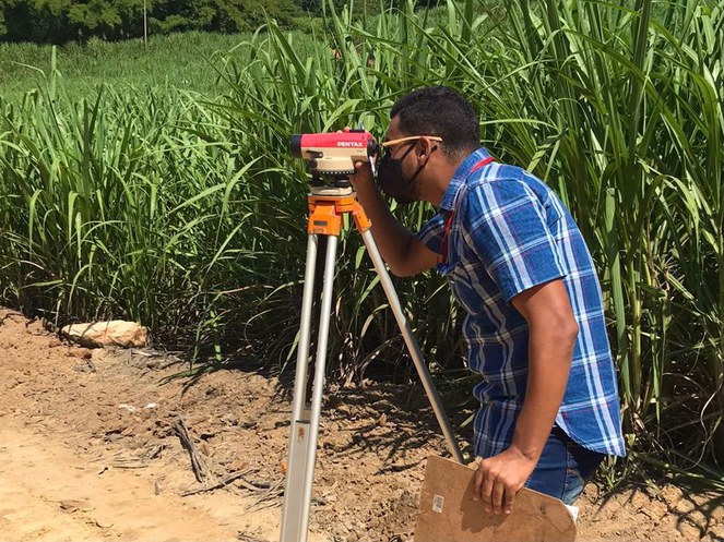 Residente Jefferson Andrade realizando levantamento topográfico e georreferenciamento de área de cultivo localizada no município de Vitória de Santo Antão, em Pernambuco
