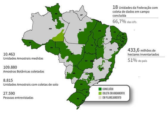 A metodologia do Inventário Florestal Nacional abrange coletas de dados em pontos distribuídos a cada 20 quilômetros de distância, por todo o território nacional, com o objetivo de produzir informações de qualidade sobre as florestas brasileiras. Essas informações são detalhadas sobre a estrutura, composição (biodiversidade), vitalidade das florestas, biomassa, estoques de madeira e de carbono e o uso de produtos e serviços das florestas.