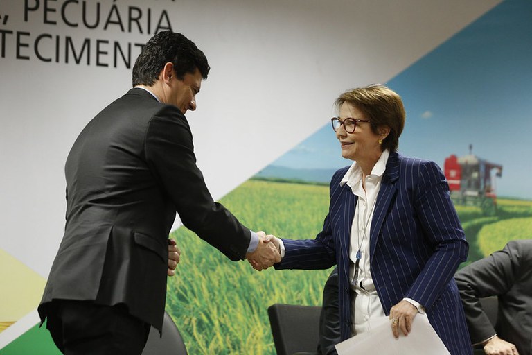 A ministra Tereza Cristina (Agricultura, Pecuária e Abastecimento) e o ministro da Justiça e Segurança Pública, Sergio Moro, assinaram nesta quarta-feira (16) acordo de cooperação técnica com o objetivo de prevenir a ocorrência da chamada “venda casada” no momento que o produtor rural toma financiamento agrícola nos bancos.