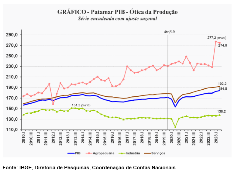 Em valores correntes, o PIB no segundo trimestre de 2023 totalizou R$ 2,651 trilhões. A Agropecuária cresceu 17% em relação a igual período do ano anterior. Esse resultado pode ser explicado, principalmente, pelo desempenho favorável de alguns produtos da lavoura que possuem produção relevante no segundo trimestre, como a soja (24,5%), o milho (13,7%), o algodão (10,2%) e o café (5,3%). O IBGE destaca os ganhos de produtividade das lavouras PIB da Agropecuária como um dos principais fatores de crescimento.