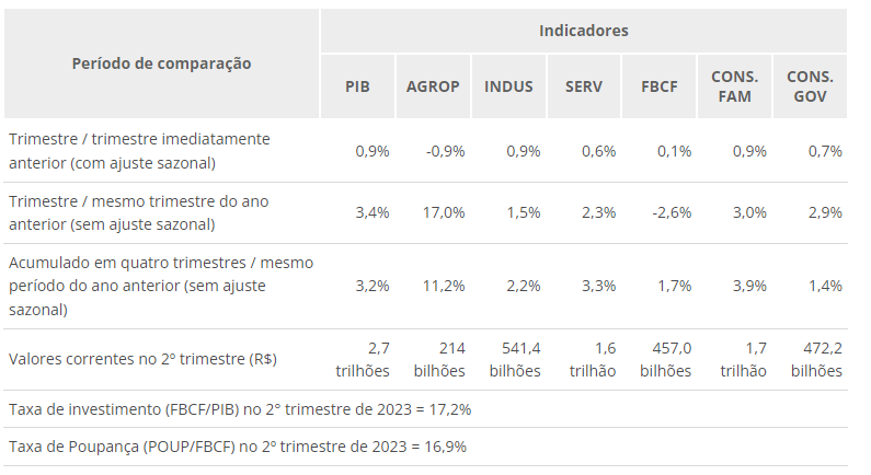 O Produto Interno Bruto (PIB) cresceu 0,9% no segundo trimestre de 2023, ante o trimestre anterior, na série com ajuste sazonal. Em relação ao mesmo trimestre de 2022, o PIB cresceu 3,4%. No semestre, a alta acumulada foi de 3,7%.