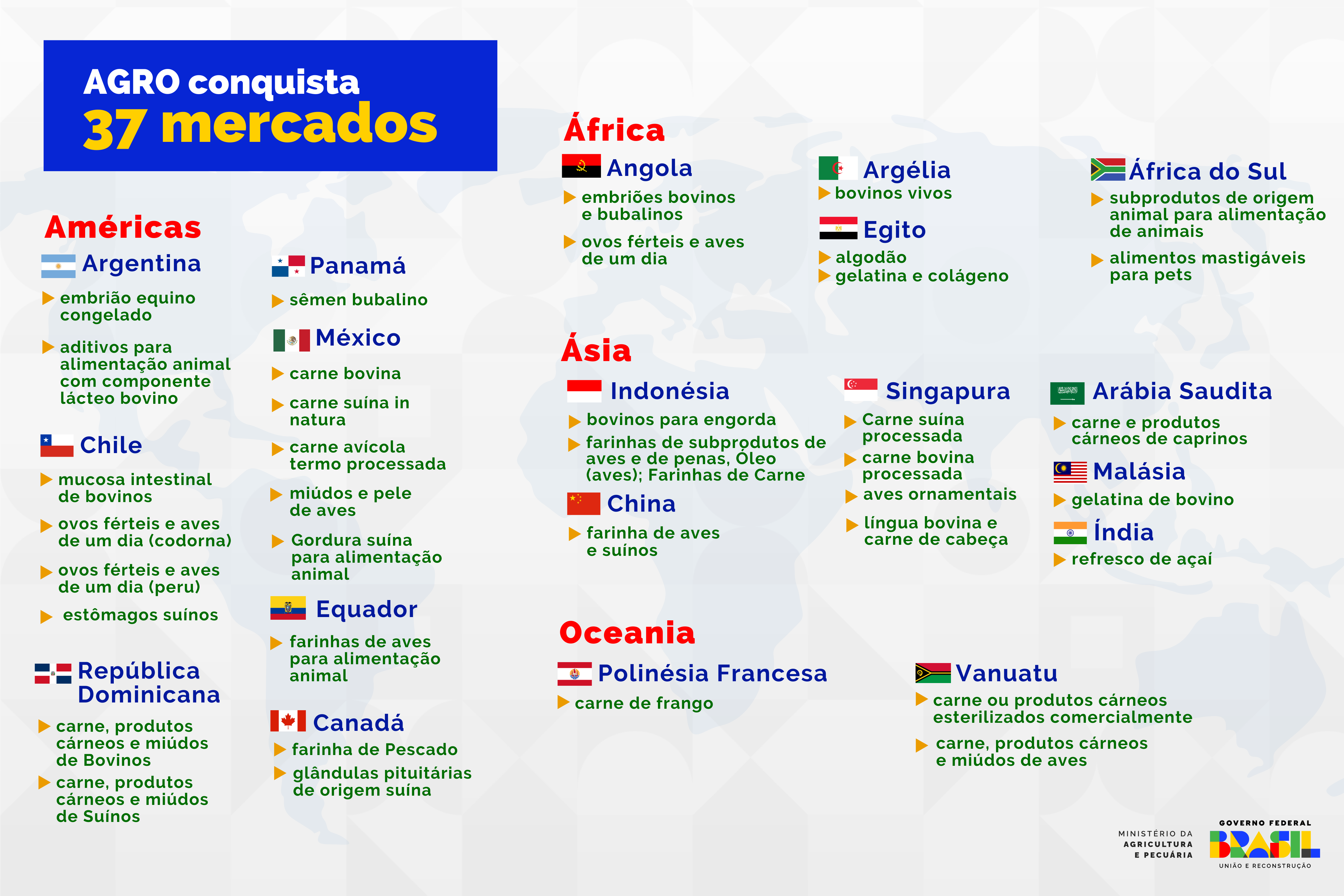 Em oito meses de governo Lula, o Brasil registra 37 novos mercados para a exportação de produtos do agronegócio. O ministro da Agricultura e Pecuária, Carlos Fávaro, comemora o resultado como fruto de negociações bilaterais que culminam no acordo dos parâmetros de sanidade a serem atestados e do certificado correspondente, sanitário, fitossanitário ou veterinário, que passará a ser aceito pelo país importador nos pontos de entrada da mercadoria.