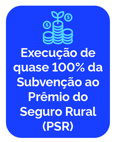 Neste ano, o Mapa garantiu a execução de quase 100% da Subvenção ao Prêmio do Seguro Rural (PSR). Destaca-se o desenvolvimento de um sistema de monitoramento com o objetivo de aprimorar as ações de fiscalização das operações contratadas no PSR, a partir da análise das áreas georreferenciadas que são indicadas nas apólices de seguro rural, especialmente em relação a seis critérios socioambientais.