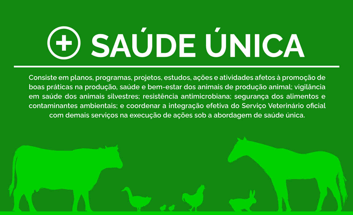 Consiste em planos, programas, projetos, estudos, ações e atividades afetos à promoção de boas práticas na produção, saúde e bem-estar dos animais de produção animal; vigilância em saúde dos animais silvestres; resistência antimicrobiana; segurança dos alimentos e contaminantes ambientais; e coordenar a integração efetiva do Serviço Veterinário oficial com demais serviços na execução de ações sob a abordagem de saúde única.