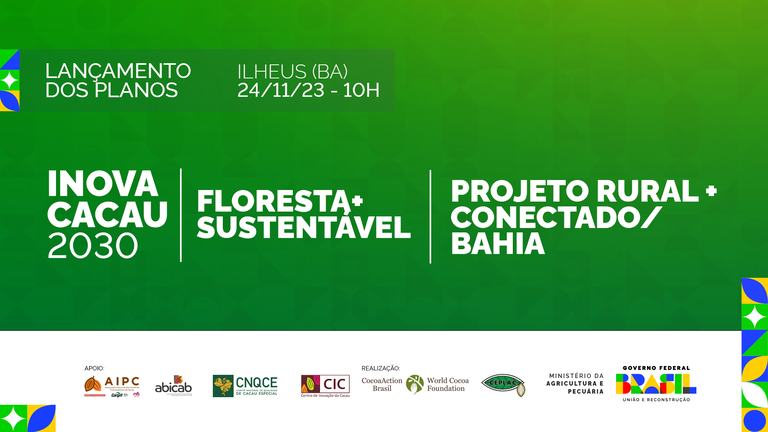 Desenvolvido em parceria com a CocoaAction Brasil, o Plano Inova Cacau 2030 atua na promoção do uso sustentável dos recursos naturais nas regiões produtoras de cacau, utilizando tecnologias eficientes e de baixo impacto ambiental, de maneira a favorecer o bem-estar dos produtores e aumentar a qualidade e a produtividade do fruto. A iniciativa tem potencial para tornar o Brasil uma referência de origem de cacau sustentável para o mundo nos próximos sete anos.