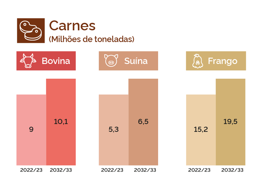 A produção de carnes (bovina, suína e frango deverá ter alta de 6,6 milhões de toneladas entre 2022/23 e 2032/33, representando 22,4% de aumento. Saindo dos atuais 29,6 milhões de toneladas para 36,2 milhões de toneladas de carnes.