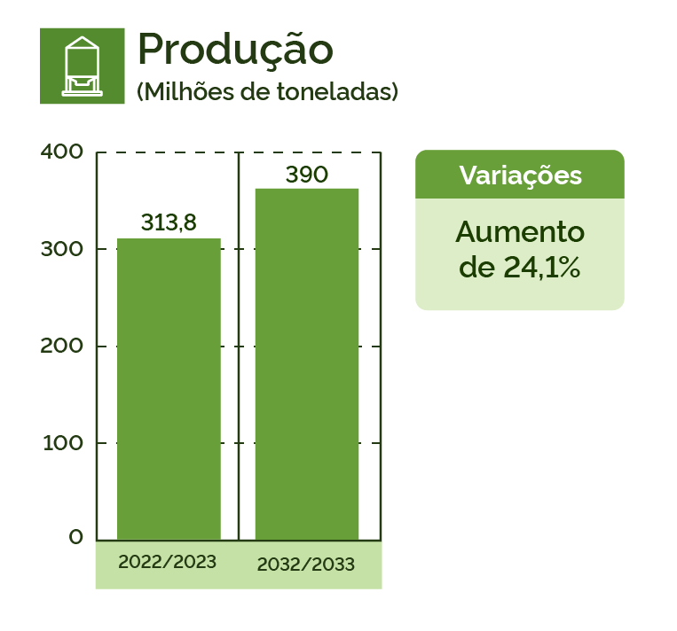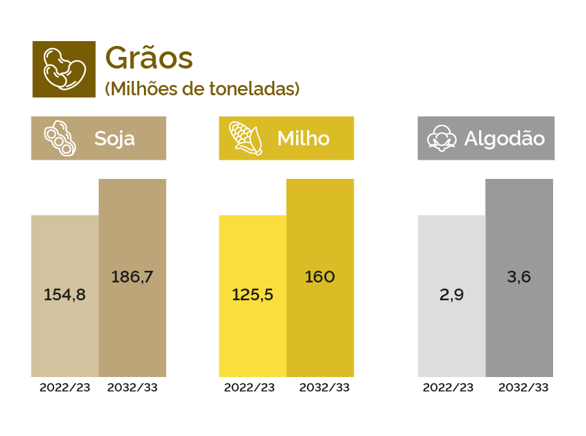 A produção de grãos no Brasil deverá aumentar 24,1% nos próximos dez anos, chegando perto de 390 milhões de toneladas na safra 2032/2033, com acréscimo de 75,5 milhões de toneladas. Esse acréscimo corresponde a uma taxa de crescimento de 2,4% ao ano. Soja, milho de segunda safra e algodão devem continuar alavancando o crescimento da produção de grãos.