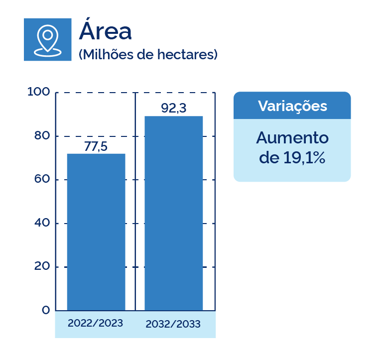 A área de grãos deve expandir-se dos atuais 77,5 milhões de hectares (Conab - maio/2023) para 92,3 milhões de hectares em 2032/33.