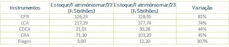 Os estoques dos títulos acompanhados pelo Boletim, relativos a março/2023, têm se apresentado bem superiores aos do mesmo período do ano passado, conforme pode ser observado na tabela abaixo. Destaque para a Letra de Crédito do Agronegócio – LCA e a Cédula de Produto Rural – CPR, com estoques de respectivamente R$ 377,74 bilhões e R$ 228,55 bilhões.