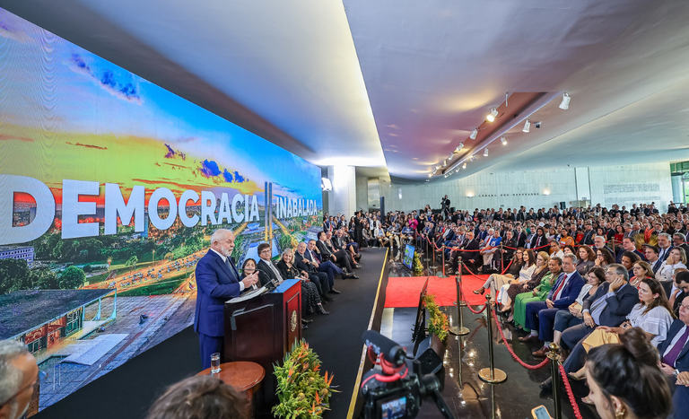 Lula ressaltou ainda que a coragem de parlamentares, governadores e governadoras, ministros e ministras da Suprema Corte, ministros e ministras de Estado, militares legalistas e sobretudo da maioria do povo brasileiro garantiu que estivéssemos hoje celebrando a vitória da democracia sobre o autoritarismo.