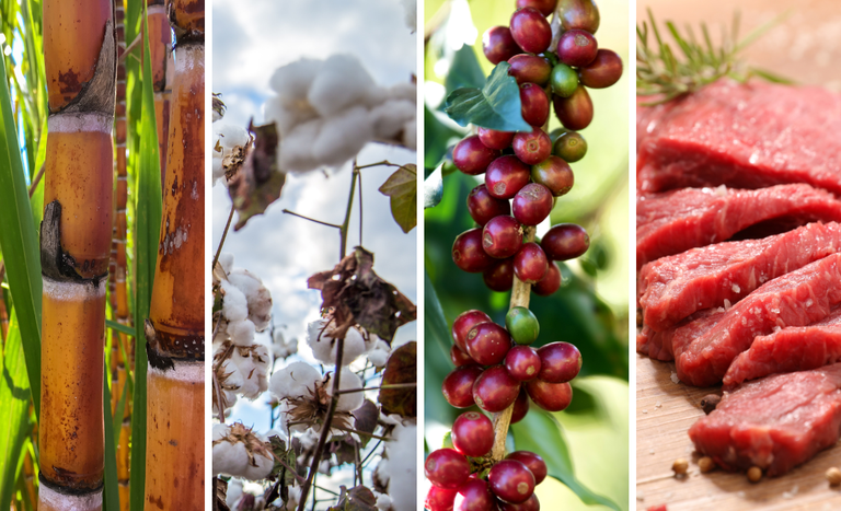 De acordo com a secretaria de Comércio e Relações Internacionais do Ministério da Agricultura e Pecuária (SCRI/Mapa), quatro produtos explicam o forte crescimento das exportações em fevereiro de 2024: açúcar (+ US$ 1,06 bilhão); algodão (+ US$ 406, 55 milhões); café verde (+ US$ 313,06 milhões) e carne bovina (+ US$ 211,65 milhões).