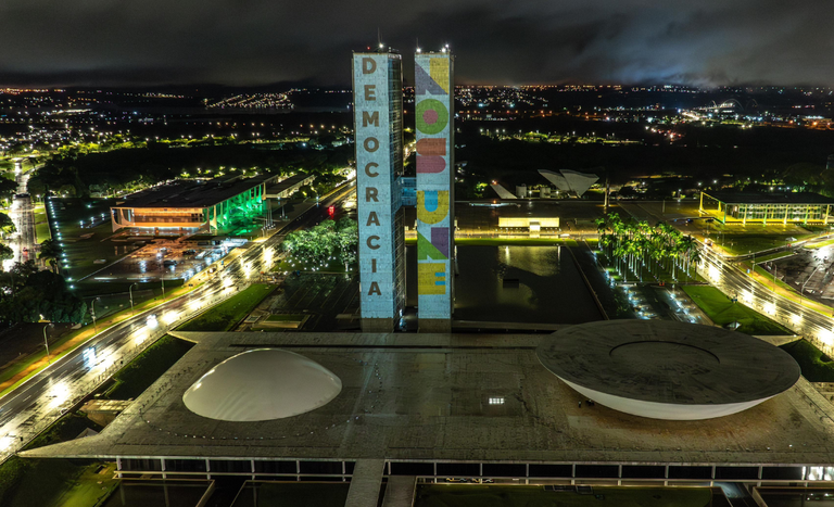 Na véspera dos eventos que marcam um ano dos ataques às sedes dos três poderes em Brasília e da rápida resposta das instituições brasileiras, uma projeção nas duas torres do Congresso Nacional deu visibilidade a uma estilização da bandeira brasileira e à frase: "Democracia nos Une".