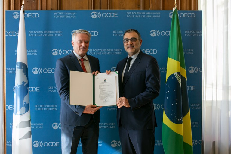 Na foto, embaixador José Sarquis, junto com o Secretário Geral da OCDE, Mathias Cormann, com a Carta assinada pelo Ministro Carlos Fávaro.