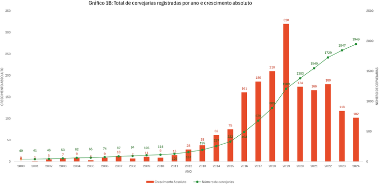 O número de cervejarias registradas no Mapa chegou a 1.949 em 2024, com a inclusão de 102 novos estabelecimentos, um crescimento de 5,5% em relação a 2023. Este é o 9º maior crescimento da série histórica.