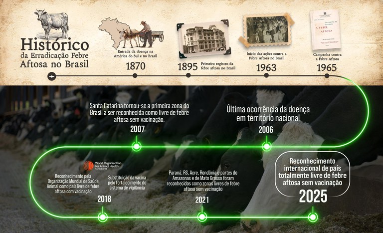 Finalmente, em 2025, após o cumprimento do período de 12 meses sem vacinação e da proibição do ingresso de animais vacinados nas áreas em transição, o Brasil obteve o reconhecimento internacional da OMSA como país totalmente livre da febre aftosa sem vacinação.