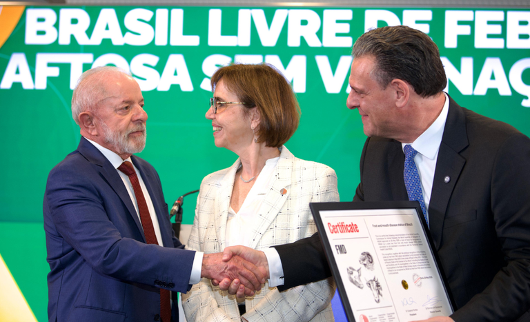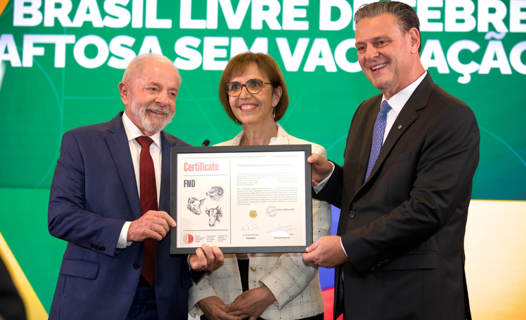 Nesta sexta-feira (6), em Paris, o presidente da República, Luiz Inácio Lula da Silva, e o ministro da Agricultura e Pecuária, Carlos Fávaro, receberam das mãos da diretora-geral da Organização Mundial da Saúde Animal (OMSA), Emmanuelle Soubeyran, o certificado reconhecendo o Brasil como país livre de febre aftosa sem vacinação.